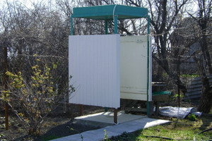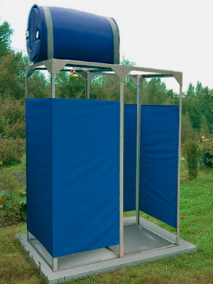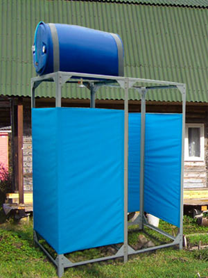 Общий тип конструкции сооружения зависит от способа подачи воды. Если бак установлен непосредственно над душевой кабиной, то понадобится достаточно прочный и жесткий каркас, способный выдержать вес бака, заполненного жидкостью (для емкости 100 л это около 200 кг). Кроме того, стенки душевой кабинки должны скрывать человека от посторонних глаз и защищать его от возможных порывов ветра.