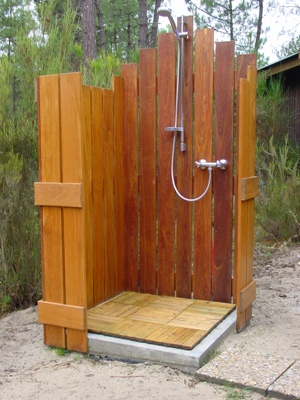 Построить летний душ своими руками можно с использованием каркасной технологии возведения стеновых конструкций. Для деревянного каркаса душевой кабинки подойдут стойки из бруса со сторонами 10 см и длиной3 м, а в качестве верхней обноски и прожилин — доски шириной не менее 10 см, толщиной около 4 см и длиной, равной стороне кабинки. Чтобы обеспечить длительную эксплуатацию душа, все части, подверженные влаге, гниению и атмосферным факторам, желательно покрыть антисептическими, влагостойкими и солнцезащитными составами, красками или лаками.