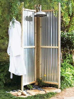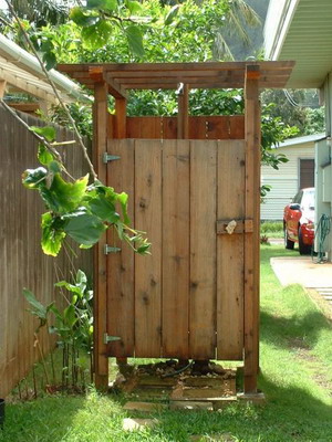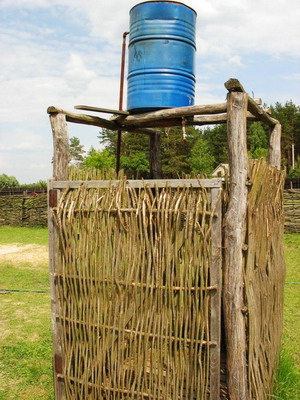 Кабинку для душа, в которую подается вода из удаленного источника, сооружают аналогичным образом, но из более легких и, возможно, менее прочных материалов. Важно, чтобы конструкция была устойчива к порывам ветра и выдерживала собственный вес. Для обшивки стенок используют непрозрачную ткань, например плотную фланель или брезент.