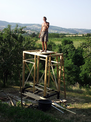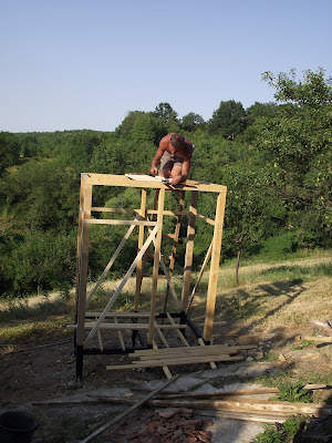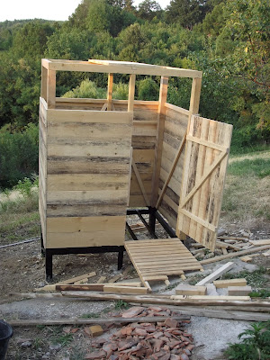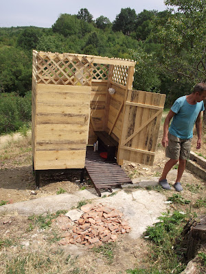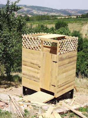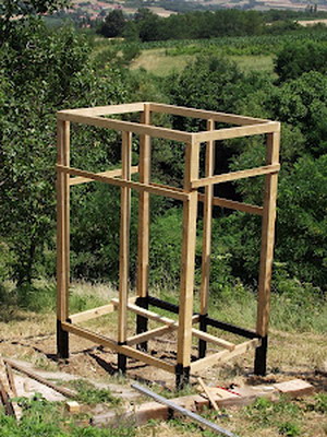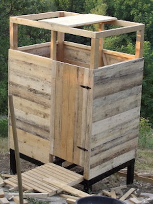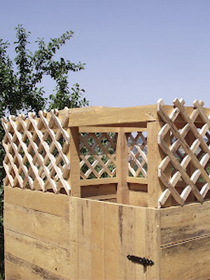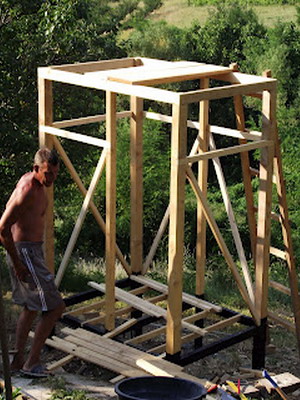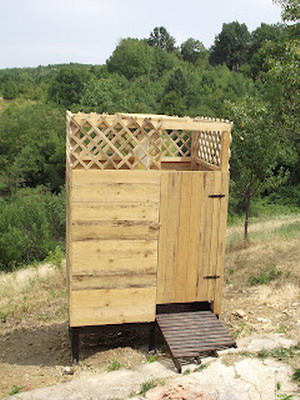 Сборку кабинки начинают с бетонирования стоек на глубину около 60 см. Затем закрепляют верхние элементы обноски и прожилины под обшивку стен, отступив от нижнего и верхнего концов стоек на 30-40 см. Далее обшивают стены, навешивают дверцы и прокрашивают все поверхности водостойкими красками и лаками.
