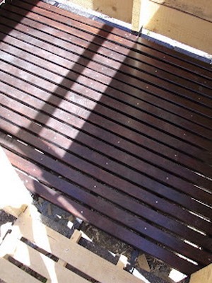 Перед тем, как построить летний душ, обустройство основания завершают изготовлением деревянного настила, задача которого — предотвратить скольжение во время использования летнего душа. Для этого подойдут бруски 100×40 мм, сбитые между собой штакетником. Итоговые размеры настила должны соответствовать площади пола. Ширину зазора между брусками рекомендуется делать не более 30 мм, чтобы не проваливались ступни, особенно детские. Такие зазоры позволяют древесине быстро сохнуть и не подгнивать.