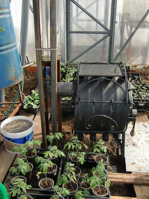 Печное отопление — самое простое, доступное и популярное у дачников. Обогрев теплицы происходит за счет тепла, выделяемого только стенками печи или стенками печи и дымоходом одновременно. В первом случае печь, преимущественно металлическую, устанавливают посреди теплицы, а в качестве топлива используют все виды горючих веществ или электричество. На печи размещают бак с водой для полива растений. В теплицах с пленочным покрытием трубу проводят сквозь негорючий сегмент крыши и оборудуют искрогасителем. Такая система отопления теплиц эффективно обогревает площадь 20-25 м2.