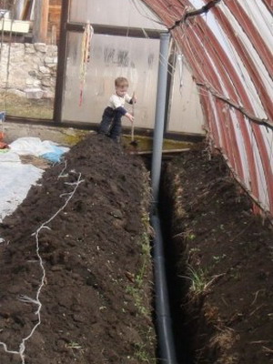 Во втором случае печь устанавливают на 0,5-1 м ниже уровня пола, в одном из концов траншеи, выкопанной заранее по осевой линии теплицы. Вдоль траншеи от печи прокладывают металлическую трубу, которую выводят на внешнюю сторону теплицы под углом 15-25°. Стены траншеи обкладывают кирпичом, поверх настилают решетчатый пол. Вертикальный отвод трубы с улицы дополнительно оборудуют задвижкой и искрогасителем. На самой печи устанавливают емкость с водой для полива растений. Несмотря на сложность установки и определенные финансовые затраты, этот тип обогрева теплицы своими руками очень эффективен при использовании твердых видов топлива: тепло, выделяемое печью и дымоходом, практически полностью уходит на обогрев теплицы. Такой способ отопления рассчитан на конструкцию площадью 16-20 м2 с шириной не более 2 м.