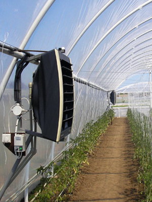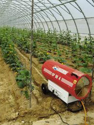 Воздушное отопление довольно редко встречается на постсоветском пространстве, но очень широко применяется в северной части Европы. В основе лежит принцип действия калорифера, когда прогрев происходит за счет принудительной циркуляции нагретого воздуха. Применительно к теплицам такая отопительная система может быть организована с использованием печей любых конструкций — достаточно добавить выдувной раструб и вентилятор. Данный вид отопления очень удобен и для обогрева парников в период неожиданных заморозков. К раструбу присоединяют один конец полиэтиленовой трубы, а другой конец внедряют внутрь полиэтиленового перекрытия.