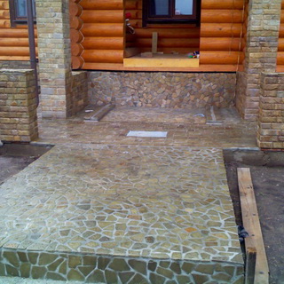 Каждый элемент из предварительно выложенного рисунка кладки, начиная с крайнего в нижнем ряду, переносится поочередно на основу. Последние же камни, образующие края выложенного рисунка, остаются лежать на месте, дополняются новыми по ходу работы. При необходимости некоторые камни подгоняются по размеру с помощью камнерезного станка или «болгарки». Можно использовать и наждачный станок, если это необходимо.