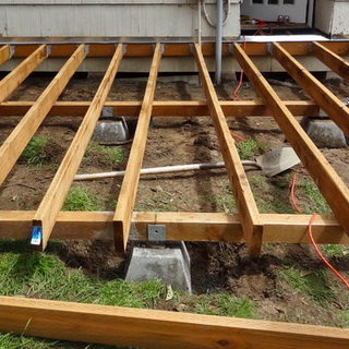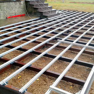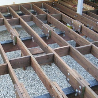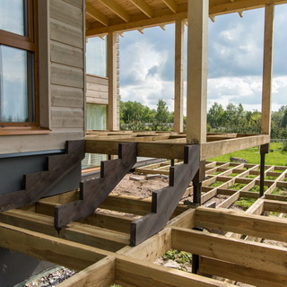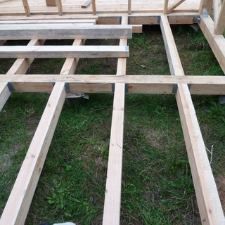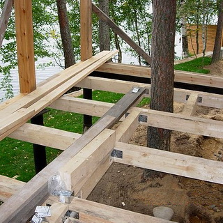 Как видно на фото, при строительстве террасы дома, стоящего на склоне, поперечные балки-лаги нарезают по размеру ширины постройки и укладывают с шагом 80 см: