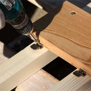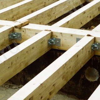 Именно с помощью металлических пластин к продольным балкам прикрепляют короткие поперечные лаги. Их укладывают в пазы крепежных элементов и соединяют, забивая гвозди или ввинчивая саморезы через отверстия.