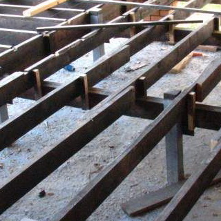 Между наружными балками обвязки и балками, прикрепленными к стенам с помощью металлических крепежных перфорированных уголков, установлены поперечные лаги такого же сечения.