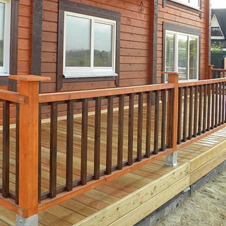 Стойки высокой терраса к дому выставляют по разметке и уровню, а затем прикручивают к балкам несущей конструкции. Доски верхней обвязки каркаса террасы прикрепляют к верхним концам стоек ограждения, контролируя их горизонтальное положение.