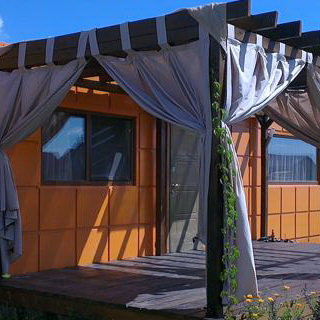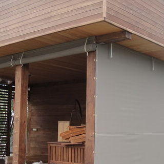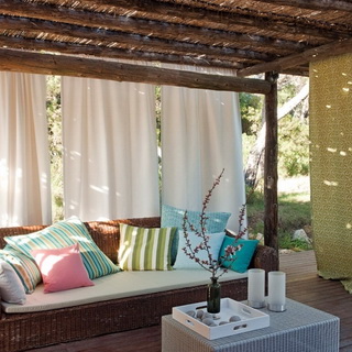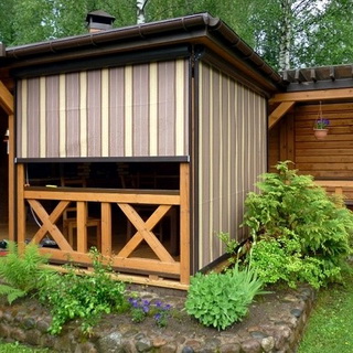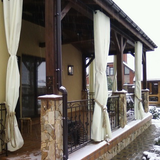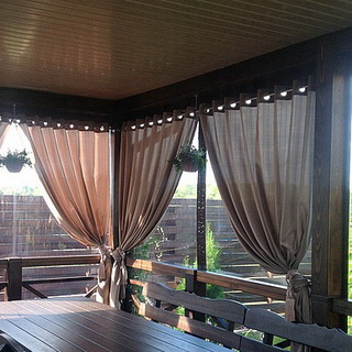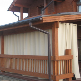 Для защиты террасы на крутом склоне от ветра, солнца и посторонних взглядов можно сшить шторы из специального маркизного полотна шириной не более 2 м.