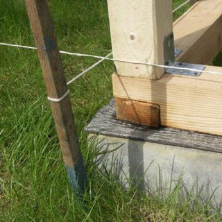 После того как бетонные основания застынут, на каждое из них в скобу анкерной заделки поставьте и прикрепите болтами опорные стойки из бруса сечением 100×100 мм. Опоры необходимо предварительно выставить в одну линию и строго вертикально. Верхние концы стоек отпилите по уровню, на котором будут лежать опорные балки нижней обвязки.
