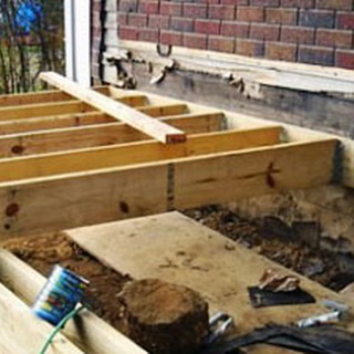 Перед тем как выполнить террасу на склоне, нужно укрепить каркас. Монтаж каркаса террасы начинают с крепления одной из балок к стене дома с помощью анкеров, предварительно выставив ее строго горизонтально. Выступающий на ширину террасы конец этой балки опирают на временную опору и фиксируют с помощью струбцины.