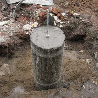 Когда ямы будут готовы, отсыпьте на их дно щебенчатые подушки, установите трубы и залейте в них бетон. Перед заливкой сверху в каждую трубу-опалубку вставьте анкерную пластину с оцинкованной скобой, к которой впоследствии будут крепиться стойки террасы. Залитые столбики с анкерными вставками оставьте на несколько дней, в течение которых цементная смесь затвердеет.