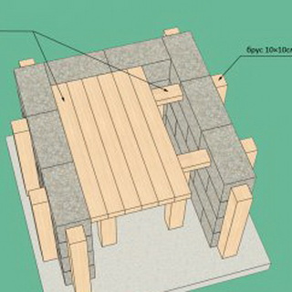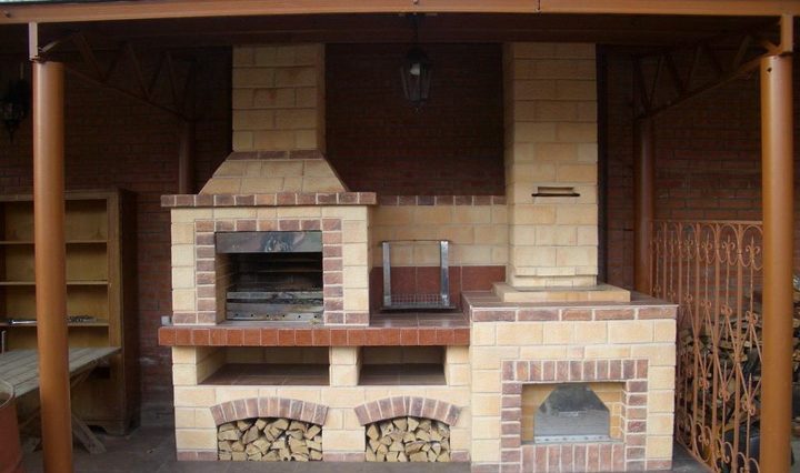 Пол вокруг конструкции рекомендуется выложить тротуарной плиткой, а разделочные поверхности лучше выполнить из керамогранита или мраморных плит. Дополнительно по желанию можно сконструировать вытяжную трубу.