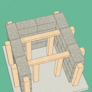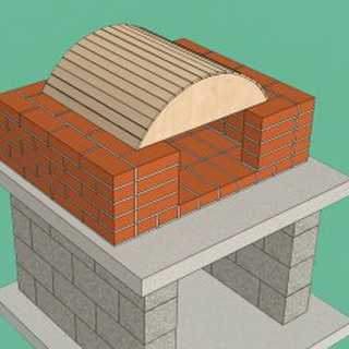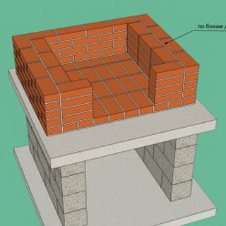 Затем можно переходить к возведению цоколя. Осуществлять кладку следует по заранее размеченной поверхности, используя строительный уровень. Для достижения большей прочности в углах рекомендуется произвести армирование проволокой. Размеры цоколя зависят от планируемой ширины топки и наличия дополнительных отсеков для дров. Кирпич следует вымачивать, чтобы он не впитывал влагу из раствора. Камень можно укладывать в сухом виде. Ширина и высота цоколя может быть различной, но вполне достаточно 5-6 рядов кирпича.
