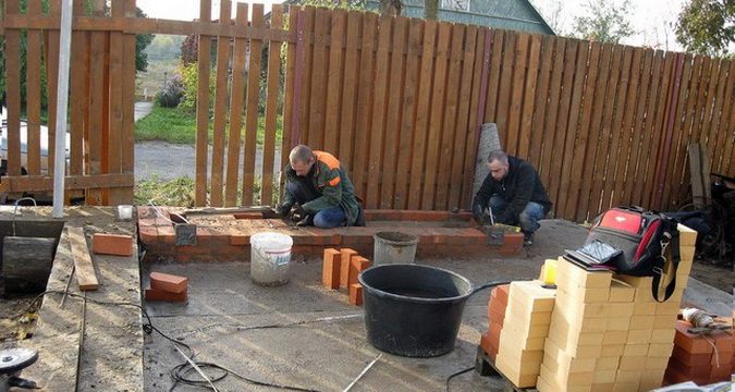 Сверху необходимо уложить армированные тротуарные плиты толщиной 5-10 см. На фундаменте следует выложить один ряд кирпичной кладки, который будет являться опорой для стен печи. Затем нужно возвести подпечье — каркас из бруса 9×9 см, соединенного внахлестку крепежными болтами. На готовый каркас будет монтироваться огнеупорная теплоизоляционная плита толщиной 8 см.