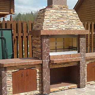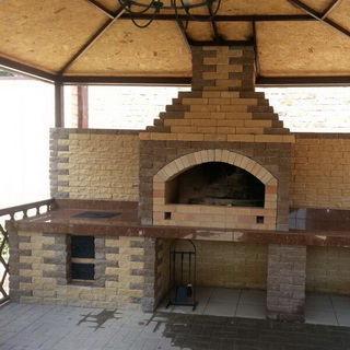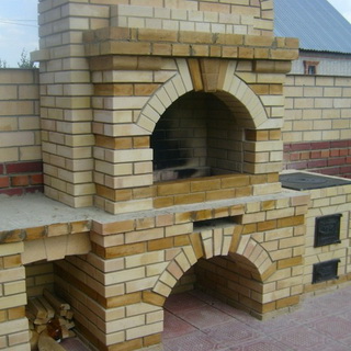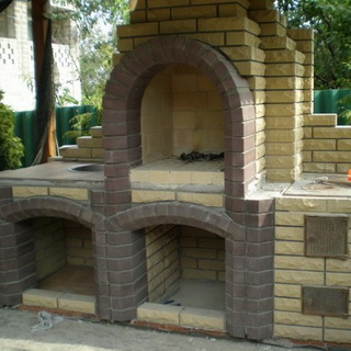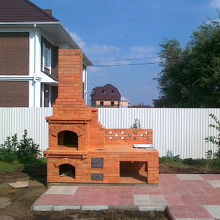 Красивый внешний вид уличные печи-камины для дачи приобретают в результате отделки, зависит это от общих пропорций, качества используемого кирпича и архитектурных деталей. Арки в данной конструкции не предусмотрены, но вместо них имеются три удобные ниши. Благодаря отсутствию криволинейных элементов такое барбекю может легко сложить даже начинающий печник.