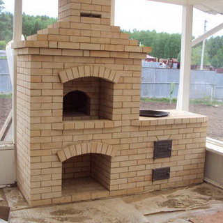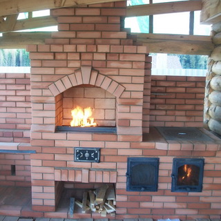 Для создания оригинальной конструкции камина с возможностью его трансформации в печь и обратно необходимо сделать приставную переднюю стенку с обычной топочной дверкой и полукруглой дверкой варочной камеры над ней. Далее представлены уличные камины из кирпича на фото, иллюстрирующих процесс их изготовления: