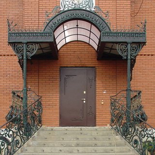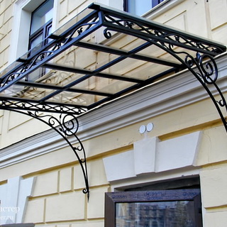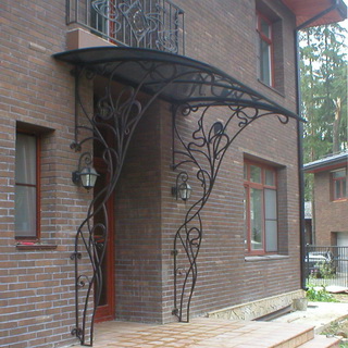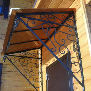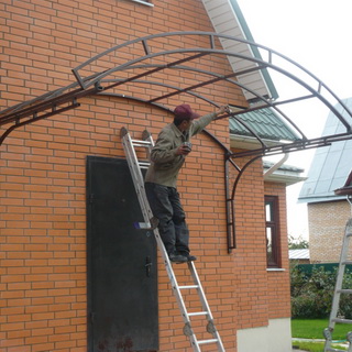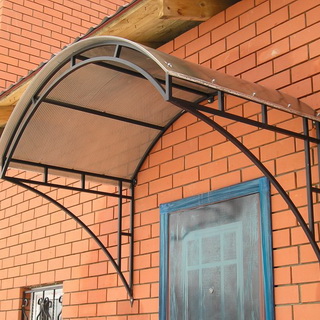 Популярным материалом для производства козырьков является металл: он полностью соответствует указанным требованиям и легко поддается обработке. Чаще всего при изготовлении металлических каркасов используют профильную, квадратную или круглую трубу сечением 20 х 20 мм, 20 х 40 мм и толщиной 1,5—2 мм или стальной уголок с полками не менее 25 мм. Основным недостатком стальных каркасов является их сильная подверженность коррозии, поэтому все узлы и детали конструкции после сварки необходимо тщательно зашкурить, обязательно прогрунтовать и покрыть специальными красками, предназначенными для обработки металлических поверхностей.