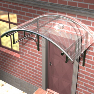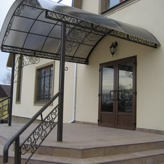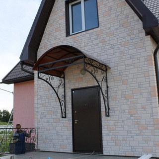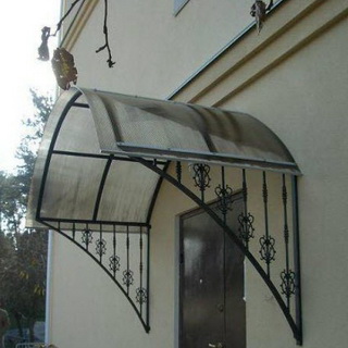 Если вы желаете, чтобы козырек выглядел более изысканно, задачу можно слегка усложнить. Представленный козырек лишь немногим отличается от приведенного выше. Основное отличие заключается в необходимости изгибать профили.