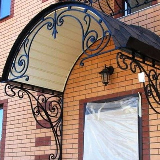 Полукруглый козырек. Для его создания вам потребуются профильные металлические трубы 20 х 20 мм для каркаса, квадрат 10 х 10, чтобы сделать фигурные вставки, и оцинкованный лист в качестве кровельного покрытия.