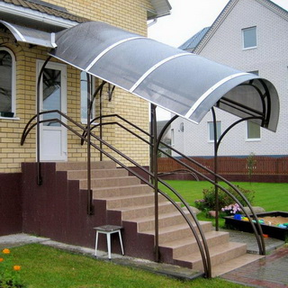 Посмотрите на фото – для навесов и козырьков над крыльцом дома наиболее практичным и надежным покрытием является сотовый поликарбонат, так как это гибкий, легкий, светопроницаемый универсальный материал: