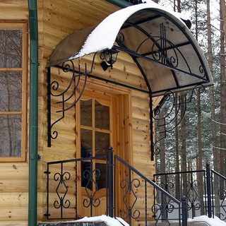 Эта конструкция козырька к дому, выполненная своими руками, не только аккуратна, но и практична: вода с такого козырька стекает в стороны, не образуя лужи на крыльце, да и снег не задерживается. Основные элементы навеса: 2 кронштейна, 2 несущих полукольца и 3 распорки.