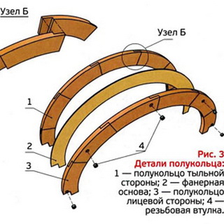 Вырезы на концах полукольца образуют уступы, обеспечивающие сопряжение элементов конструкции. Поэтому их размеры должны быть также увязаны с выбранным сечением деревянных брусков, закрепленных на кронштейнах.