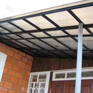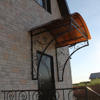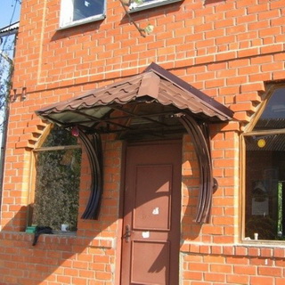 Материалов для покрытия каркаса навесов можно найти довольно много — это сотовый поликарбонат, ПВХ, триплекс, стекло, профнастил, оргстекло, шифер. Но чаще всего кровлю козырьков у входа в дом и пристенных навесов делают из такого же кровельного материала, которым отделана крыша самого дома, то есть из остатков листового металла, неиспользованной керамической черепицы, металлочерепицы и т. п.
