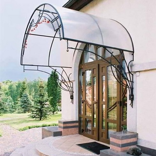 Чтобы сделать такой козырек из поликарбоната своими руками, из профиля нужно выгнуть одинаковые полукруглые арки, к которым приварить нижние и центральные перемычки. Это основа каркаса. Две арки соединяют перемычками, после чего к ним приваривают подкосы, согнутые из того же профиля, и опорные кронштейны из профильной трубы или уголка. Теперь нужно выгнуть фигурные элементы из квадрата или арматурного прута (форма этих элементов зависит только от предназначенного для них места и вашей фантазии). Полученные вставки размещают в проемах арки и приваривают во всех точках соприкосновения с каркасом.