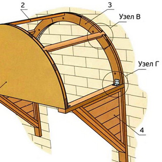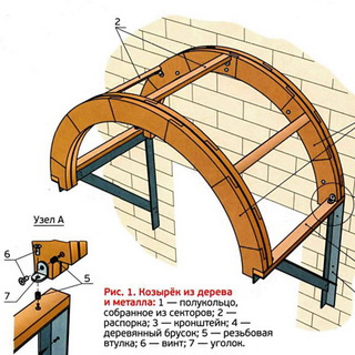 К верхней части кронштейнов прикрепляют шурупами деревянные бруски, на которых непосредственно монтируют несущие полукольца. Для изготовления одного полукольца из фанеры толщиной 4—5 мм вырезают дугу в соответствии с выбранными значениями внешнего и внутреннего радиусов. Затем, используя этот шаблон, из доски толщиной 20—25 мм изготавливают отдельные секторы полукольца. Их подгоняют друг к другу так, чтобы стыки, расположенные по разные стороны от фанерной основы, были смещены относительно друг друга. Этим достигается необходимая жесткость полуколец, которые являются несущими элементами для материала кровли. Для крепления секторов к фанере при выполнении козырька над входной дверью своими руками используют клей ПВА и шурупы.