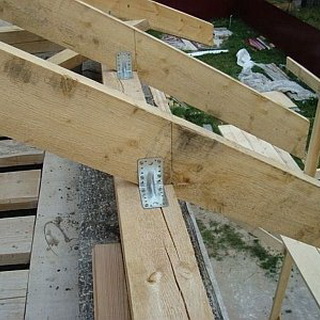 Водосточный желоб можно подвесить на кронштейнах к выступающим торцам стропил, но гораздо лучше еще до начала сборки каркаса на передних концах стропил сделать полукруглые вырезы-«курицы», в которые и будет укладываться желоб. А чтобы отрегулировать необходимый угол его уклона, под передний край стропил устанавливают небольшие подкладки.