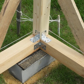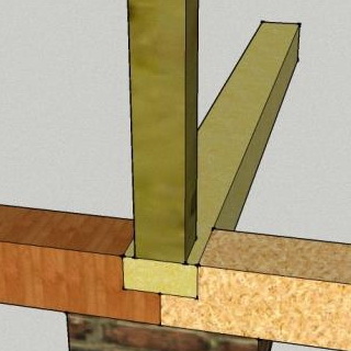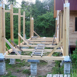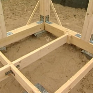 Между двумя угловыми (передними) стойками к основанию прикручивают цельный опорный брус той же ширины в сечении, что и соответствующий профиль стоек.