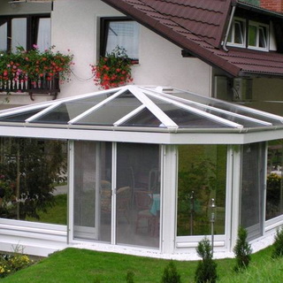 Прежде чем приступать к монтажу кровли зимнего сада, на деревянные стропила нужно прикрепить алюминиевые несущие профили с помощью шурупов. Подготовленные листы сотового поликарбоната укладывают на стропила и крепят защелкивающимися верхними профилями. Длинные листы не тяжелые, но очень неудобные в работе, поэтому и здесь строителю не помешает помощник.