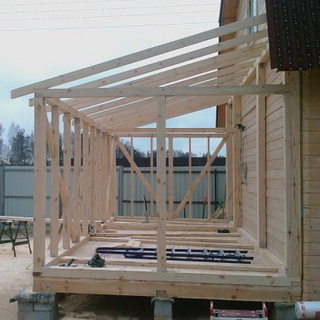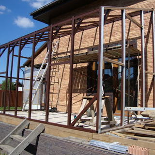Следующий этап пристройки зимнего сада к дому, как показано на фото, – установка угловых стоек и боковых прогонов: