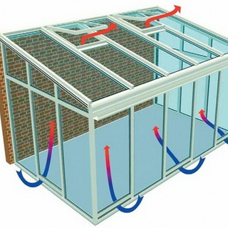 Следует учитывать, что без правильно организованной вентиляции летом температура внутри остекленной конструкции, расположенной на солнечной стороне, может достигать 70 °С, а это губительно даже для тропических растений. Предотвратить перегрев зимнего сада можно, предусмотрев вентиляционные отверстия, которые следует расположить в верхних точках конструкции.