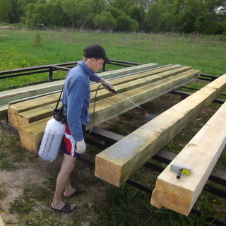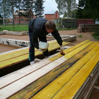 Перед тем как пристроить к дому зимний сад, прежде чем монтировать каркас, все деревянные детали необходимо обработать специальным средством для защиты древесины от гниения, влаги, солнца и вредителей. Защитное средство наносят тонким слоем с помощью плоской кисти и оставляют сохнуть на 12 часов. Затем обработку нужно повторить, нанеся еще один слой без промежуточной шлифовки. Пятна с поверхности плитки необходимо удалять сразу.