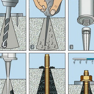 Методика фиксации крепежа с помощью химического анкера чрезвычайно проста. С помощью пистолета клеящий состав из картриджа выдавливают внутрь заранее подготовленного отверстия, после чего вставляют металлический крепежный элемент. Синтетическая смола глубоко проникает в поры соединяемого основания, а после затвердевания надежно соединяет резьбовую шпильку с основанием, образуя монолит.