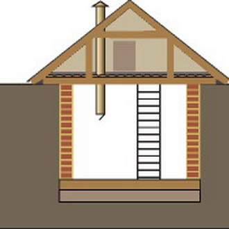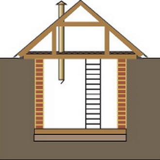Когда короб для погреба готов, начинать сооружение перекрытия. Традиционно многие дачники ограничиваются плоской, односкатной или двухскатной крышей с проемом для входа. Но есть и более совершенная конструкция, подходящая как для жарких, так и для морозных регионов. Изначально определяют удобное место для входа и по перпендикулярным к нему сторонам устанавливают стропила из доски сечением не менее 50×120 мм и шагом 90 см. Нижнюю часть стропил подшивают доской или любым подручным листовым материалом, оставляя проем 90×90 см со стороны входа, а с противоположной стороны в подшивке проделывают отверстие для вентиляционной трубы. Пространство между стропилами заполняют теплоизоляционным материалом. Поверх стропил нашивают горбыль внахлест или доски толщиной не менее 35 мм. Затем все покрывают глиняной стяжкой, а поверх настилают крышу. Так создается своеобразный воздушный мешок, обеспечивающий дополнительную теплоизоляцию.