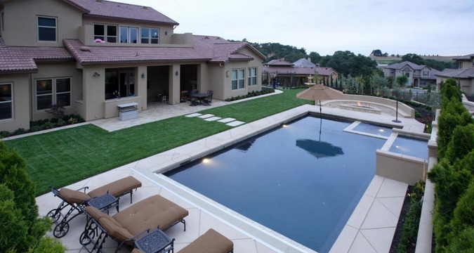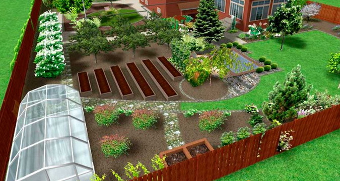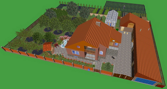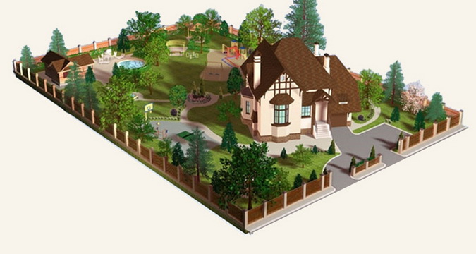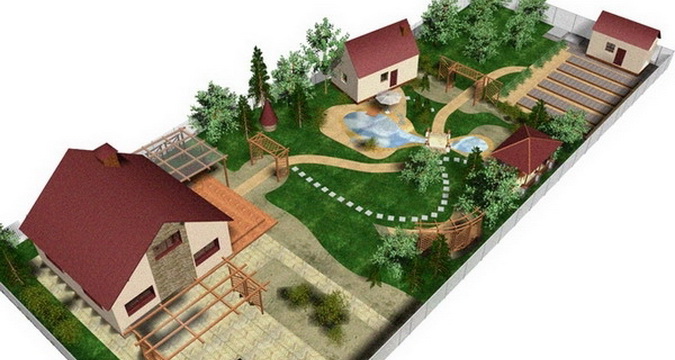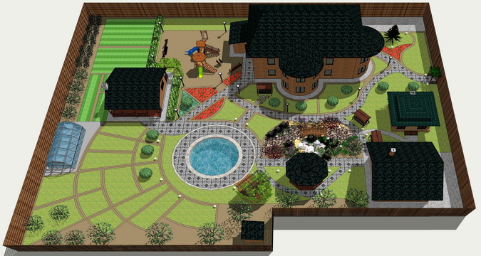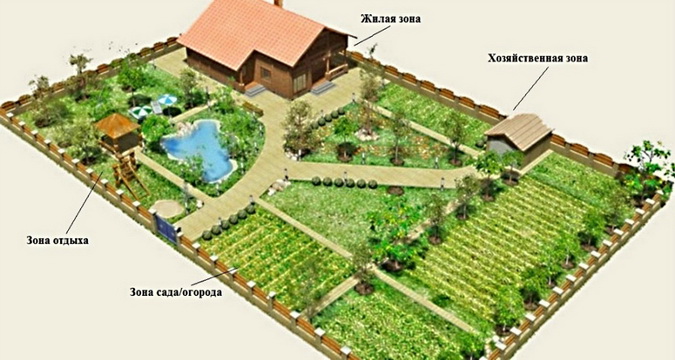 Здесь же можно устроить соразмерный площади участка водоем (пруд или бассейн), не дренирующий свои воды в грунт. Располагать жилую зону в глубине территории имеет смысл в том случае, если проведение садово-огородных и животноводческих работ не планируется и хозяйственная зона невелика.