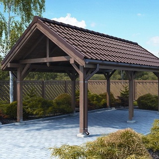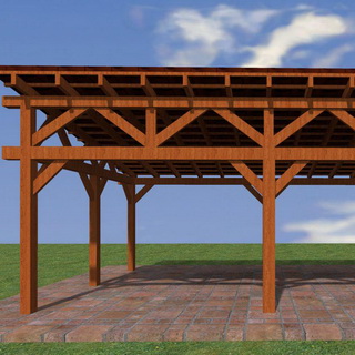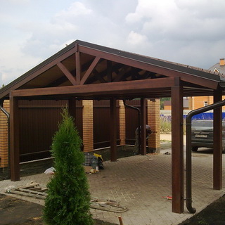 Отдельно стоящий навес вполне можно изготовить и из дерева. Такой навес тоже имеет весьма простую каркасную конструкцию. Ее основой являются стойки из бруса 100 х 100 мм, но не вкопанные, а закрепленные в башмаках. Последние приварены к трубам 060 мм, которые уже вбиты в грунт на глубину около 1,2 м.
