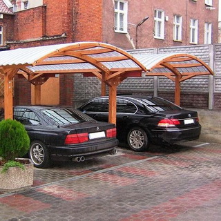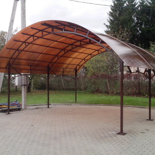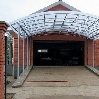 Навес для автомобиля из поликарбоната, возводимый своими руками, может быть как отдельно стоящим, так и пристроенным к дому. Отдельно стоящий навес должен быть достаточно отнесен от дома, чтобы сходящий с крыши дома снег не повредил легкую кровлю. Пристроенный навес должен иметь угол ската 12—14°, чтобы снег с кровли, не задерживаясь, соскальзывал вниз.