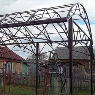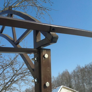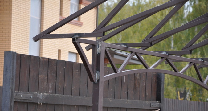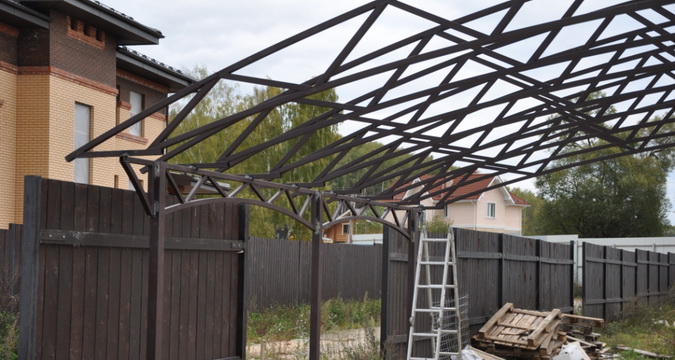 При строительстве навеса для автомобиля на стойки приваривают верхний пояс, к которому приваривают фермы. Если конструкция большая и массивная, допустимо для усиления жесткости между опорами дополнительно приварить арки.