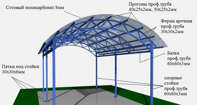 Конструктивно навес состоит из опор, ферм, лаг и кровли. При монтаже обычных автомобильных навесов принято устанавливать фермы с шагом примерно 1 м и поперечные стропилы с шагом 0,5 м. При этом следует учесть, что стыки листов поликарбоната должны приходиться на обрешетку.