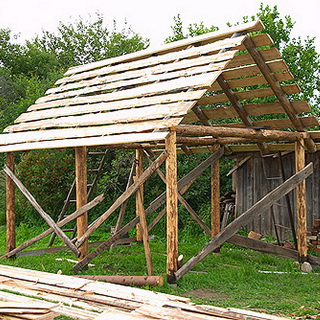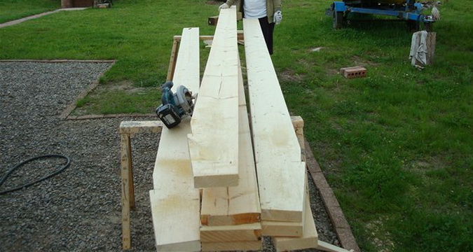 Для придания жесткости всей конструкции необходимо использовать подкосы, для изготовления которых вполне подойдут обрезки от стоек. Для верхней обвязки и затяжек стропил вполне достаточно доски сечением 40 х 100 мм.