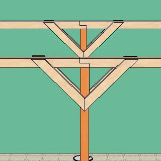 Верхнюю обвязку делают из той же доски «на ребро». Аналогично выполняют и стропила, каждое из которых устанавливают на верхнюю обвязку пазом на их нижнем конце. Верхние концы стропил крепят к стене дома кронштейнами. Их можно прикрепить к опорной доске, закрепленной на стене дома.