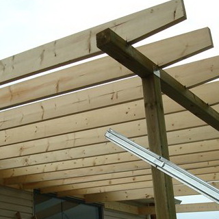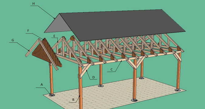 Конструкция сооружения проста: столбы-опоры, стропила скатной крыши, элементы жесткости. Размеры сооружения каждый застройщик выбирает индивидуально. Но если размеры навеса больше 4,5 м в длину и 2,5 м в ширину, то количество столбов должно быть больше четырех.
