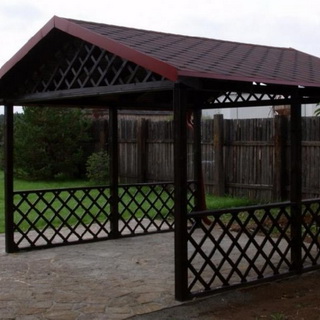 Соорудив каркас навеса, можно приступать к его обшивке. Для крыши вполне подойдет любой кровельный материал, от простейшего рубероида до черепицы. Конечно, лучше использовать современные материалы — например, металлочерепицу, битумные волнистые листы, мягкую кровлю и т. п. Они устойчивы к влаге, не боятся гнили, не нуждаются в периодической окраске, да и срок службы качественного продукта выше.