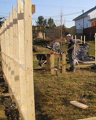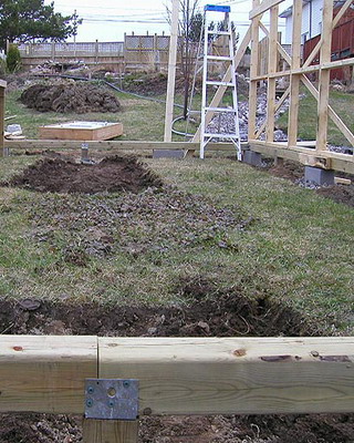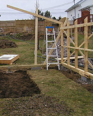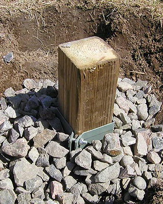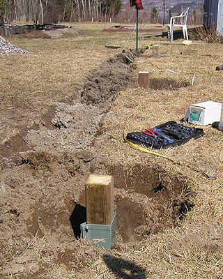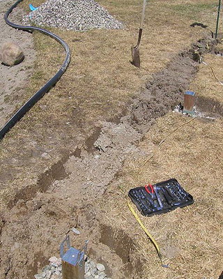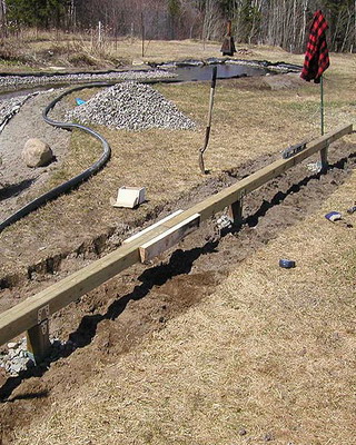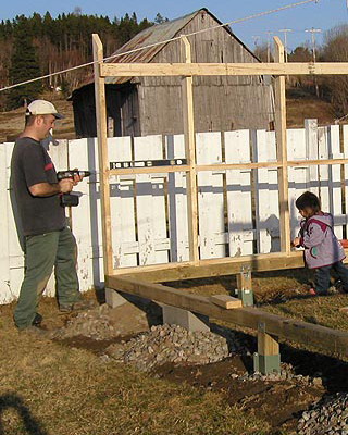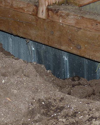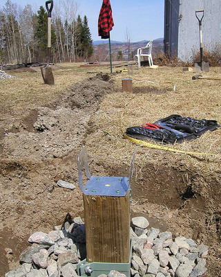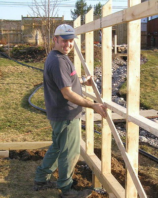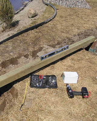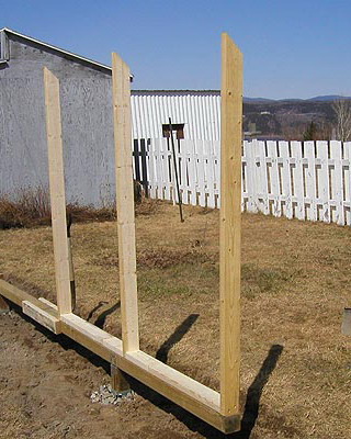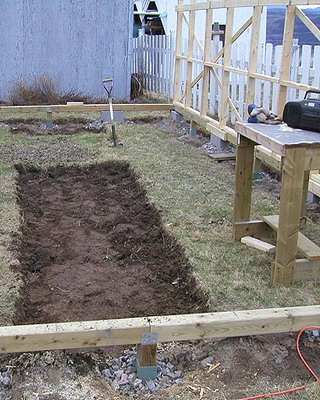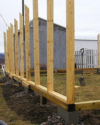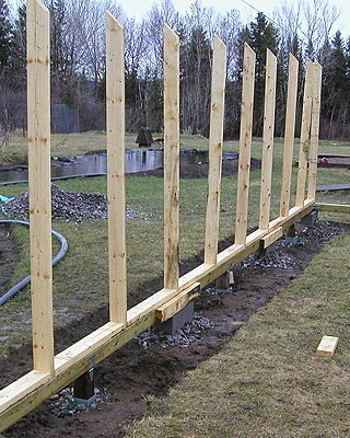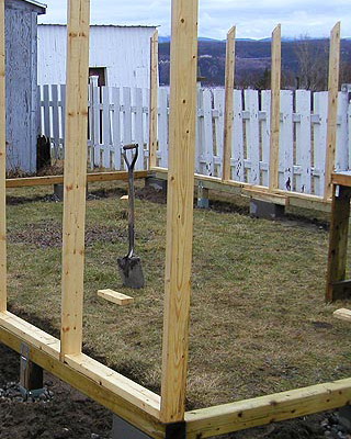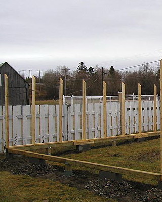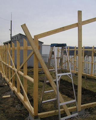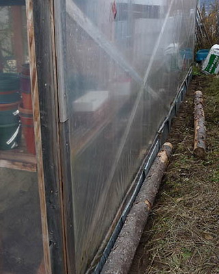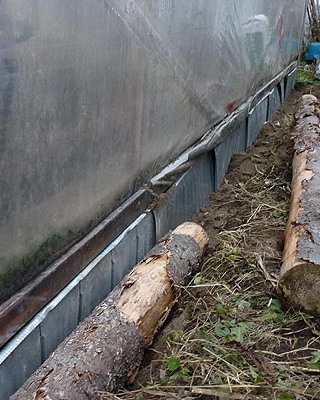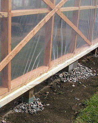 Окончив сборку стен, приступают к закреплению основания конструкции. На неровных участках предварительно выравнивают поверхность. Затем на глубину не менее 50 см на расстоянии 15-20 см от углов с дальнейшим шагом не более 2 м забивают колья, изготовленные из досок сечением 35×100 мм и длиной 60-70 см. Чтобы колья не раскололись в процессе вбивания, на место удара подкладывают обрезок доски или рейки. Вбитые колья соединяют с основанием теплицы гвоздями или шурупами соответствующей длины. Затем производят засыпку на высоту 5-10 см от низа основания, а с внешней стороны поверх укладывают рубероид, бетонные плиты или шифер шириной около 40 см. Для регионов, где зимой стоят продолжительные морозы с температурами ниже -20 °С или выпадают обильные (ливневые) осадки, необходимо предусмотреть столбчатый или ленточный фундамент.