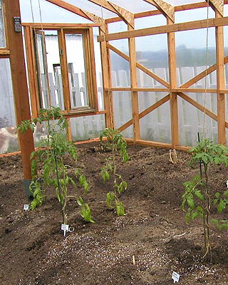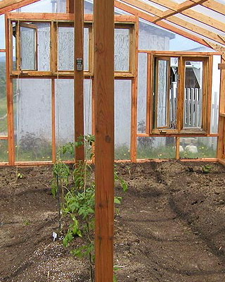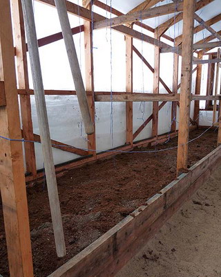 По периметру стен желательно настелить цементно-песчаную стяжку или уложить куски шифера. Аналогичным образом поступают и с остальными видами теплиц.